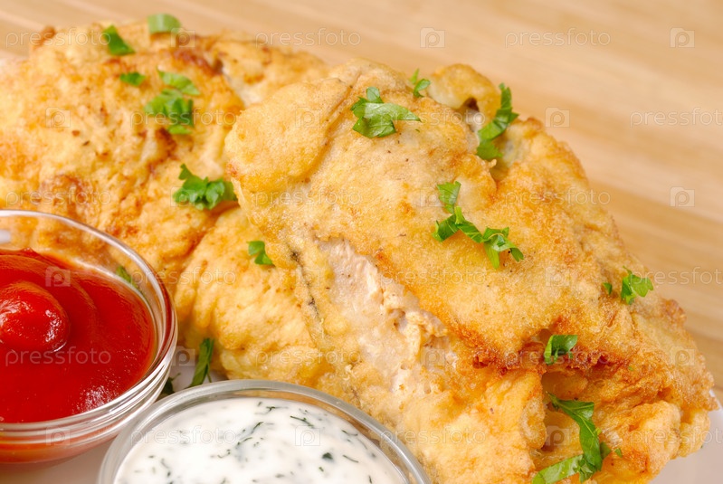 Жареной рыбой, майонез и кетчуп на деревянный стол