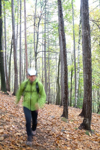 Турист прогулки в лесу. Дождь день, осенью сезона. Эффекта размытия. Горизонтальная форма