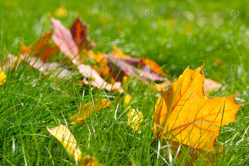 Опавшие листья на яркой зеленой траве. Малая глубина резкости