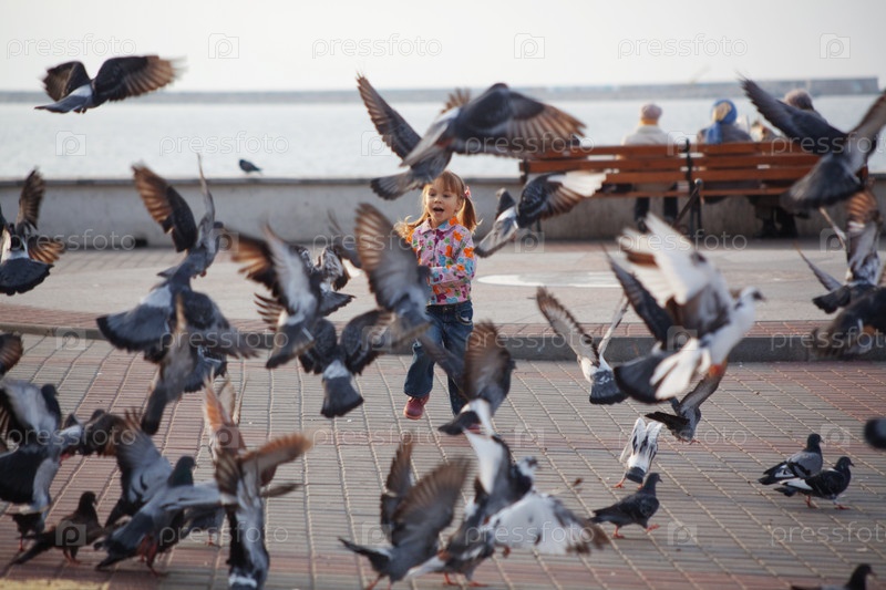 Девочка кормит голубей