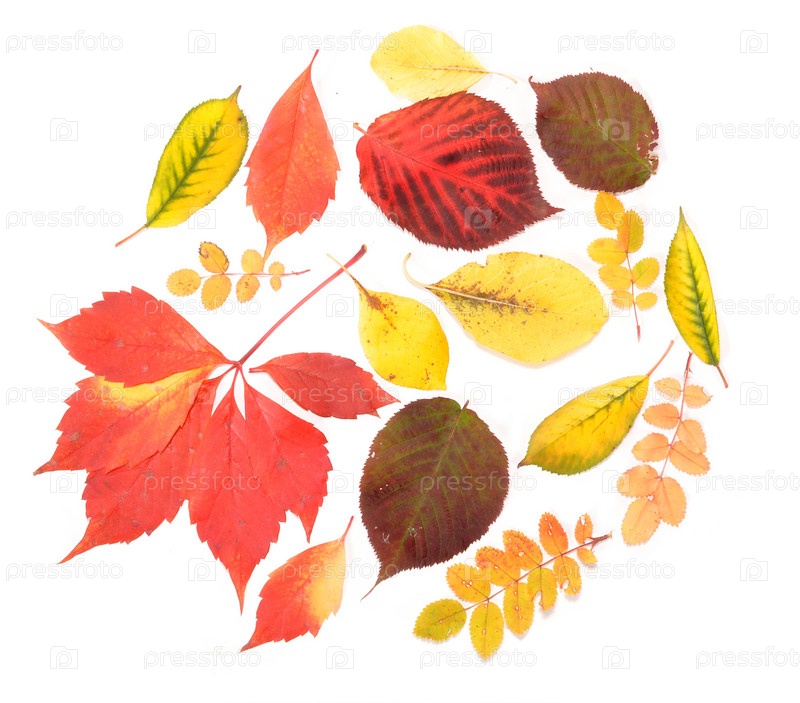 Осенние листья разных цветов на белом фоне