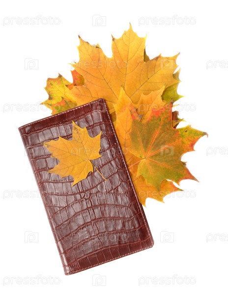 Желтые кленовые листья в кошельке на белом фоне