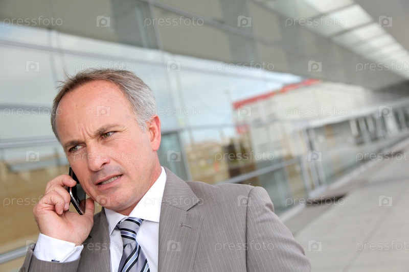 Бизнесмен с мобильного телефона перед современное здание