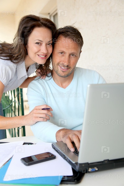 Пара, работающих на дому, на портативном компьютере