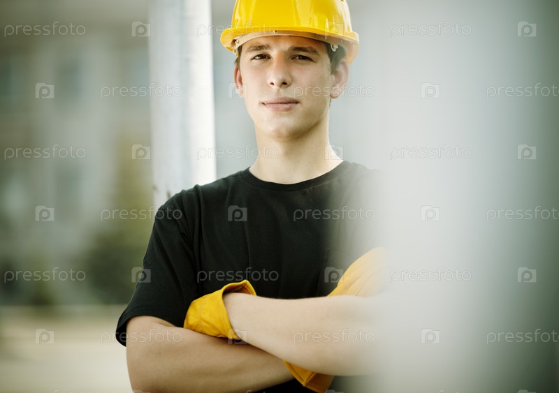 Молодой работник на стройке, выборочный фокус на лице