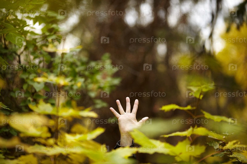 Рука человека в глубине листвы, естественный свет, выборочный фокус