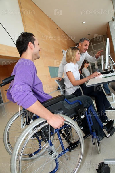 Человек в инвалидной коляске, работающие в офисе