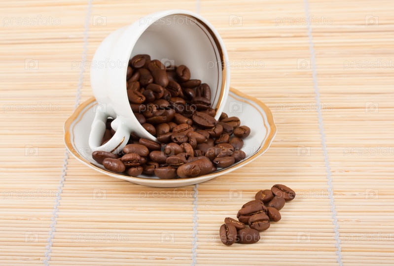 Чашка и блюдце с кофейными зернами на бамбуковой циновке