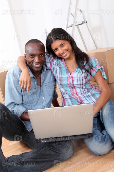 Пара, используя портативный компьютер в их новом доме