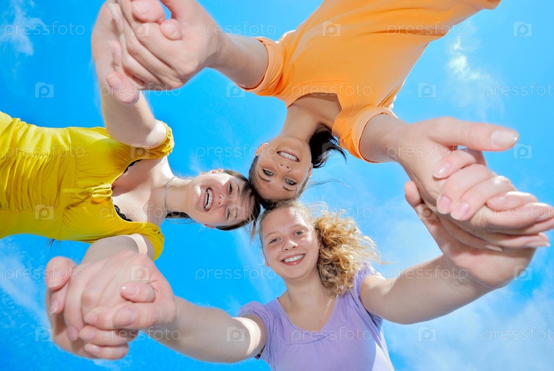 Три счастливым подростка подруг, взявшись за руки под голубым небом