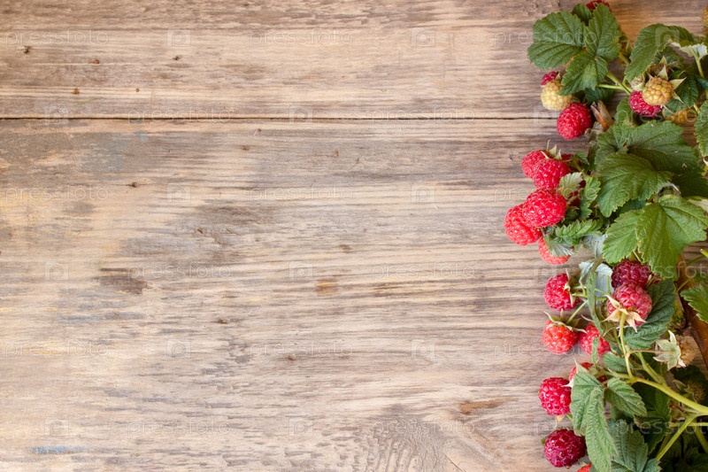 Свежий спелой малины с крупными листьями на старый деревянный стол с копией пространства