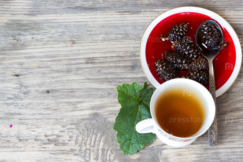 Варенье из зеленых сосновых шишек на старый деревянный стол с копией пространства