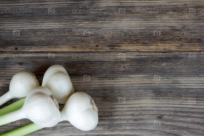 Свежий чеснок луковицы с длиной стебля на деревянный стол с копией пространства