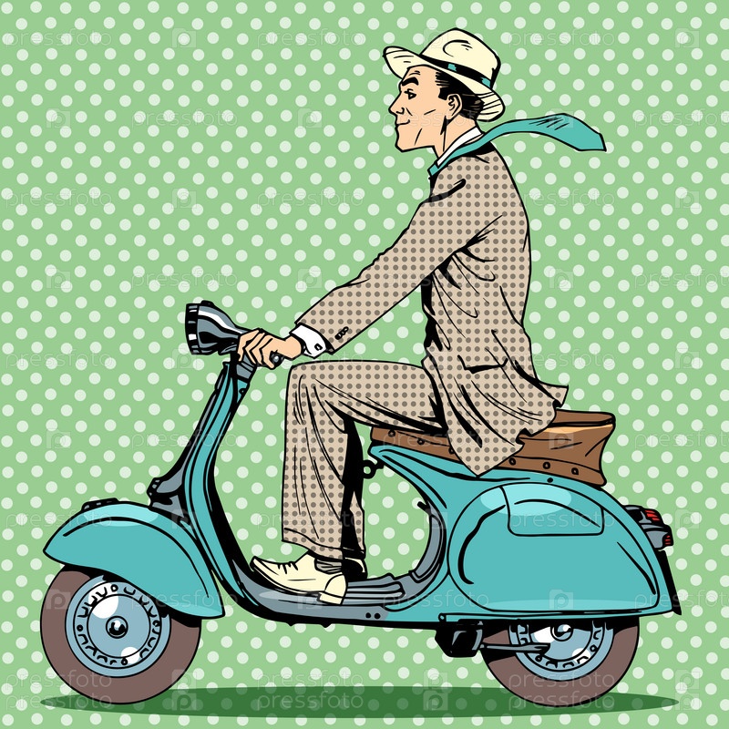 Человек едет на ретро скутер. Путешествие автомобиля дорожных машин