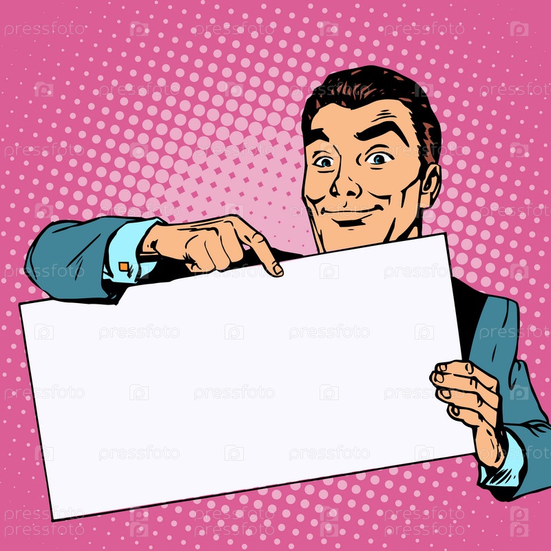 Реклама человек с баннер место для текста. Человек, указывая пальцем в стиле ретро