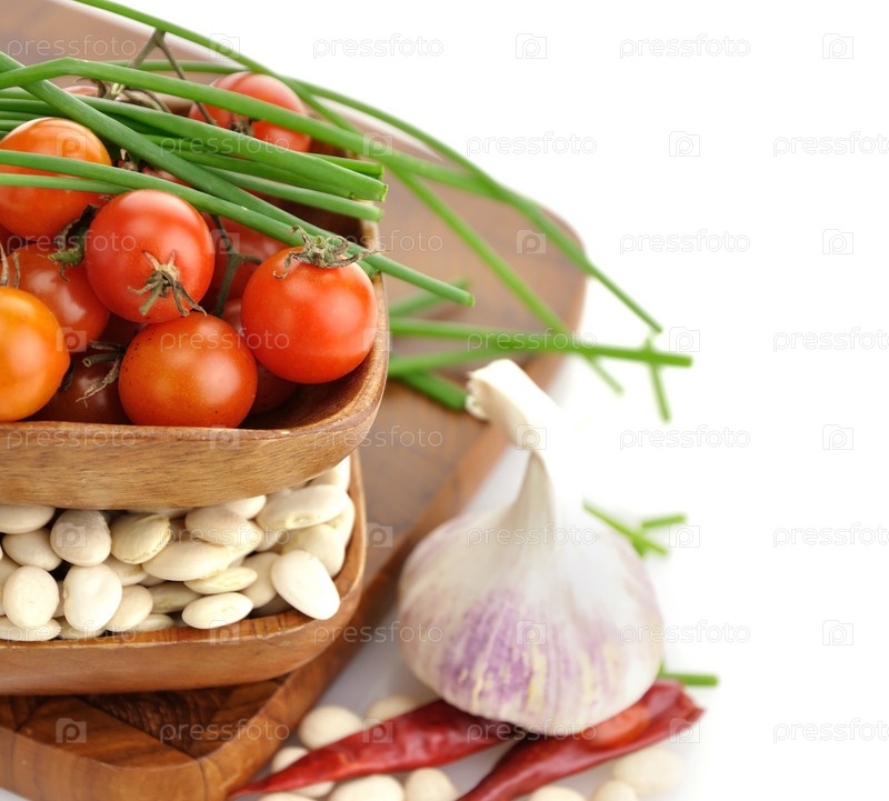 Лимская фасоль, помидоры и специи в деревянные чаши