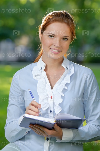 Портрет молодой симпатичной женщины с записной книжкой в парке
