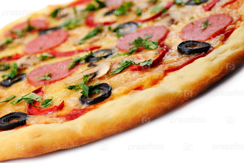 Пицца с грибами и креветками оливки на белом фоне