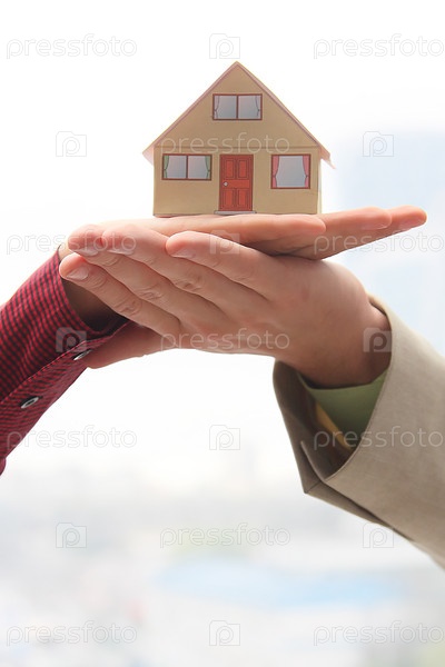 Бизнесмен и бизнес-леди держат вместе фигурку домика