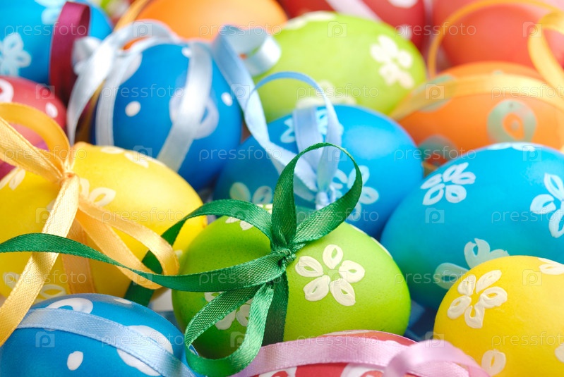 Окрашенные пасхальные яйца с бантиками равномерный фон