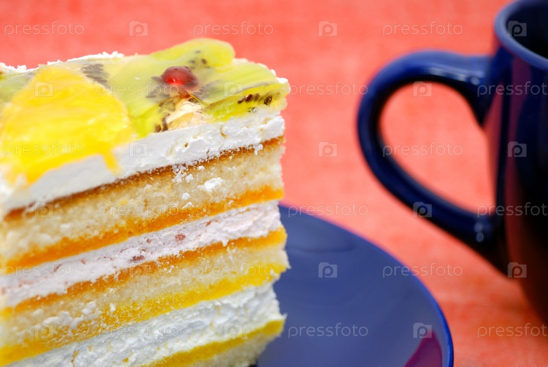 Бисквитный торт с фруктами на вершине. Синий посуда красный фон
