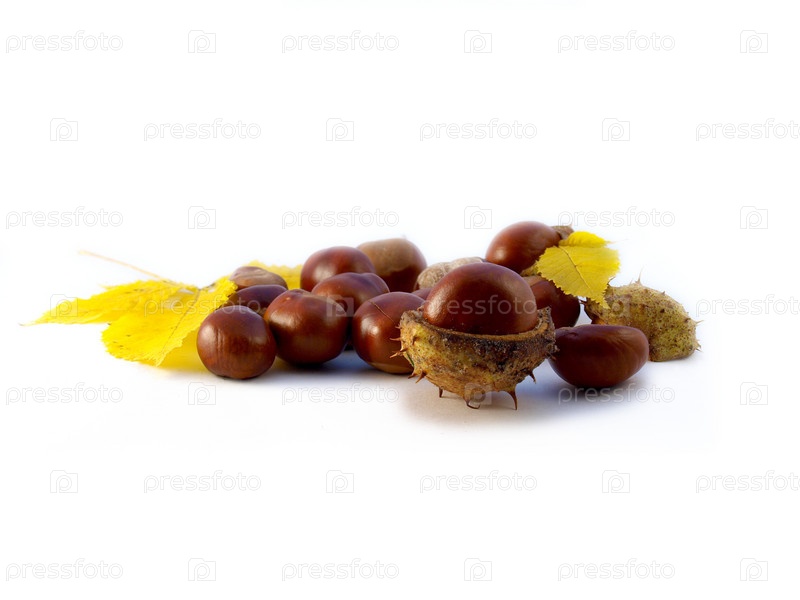 Каштаны и цветные листья на белом фоне