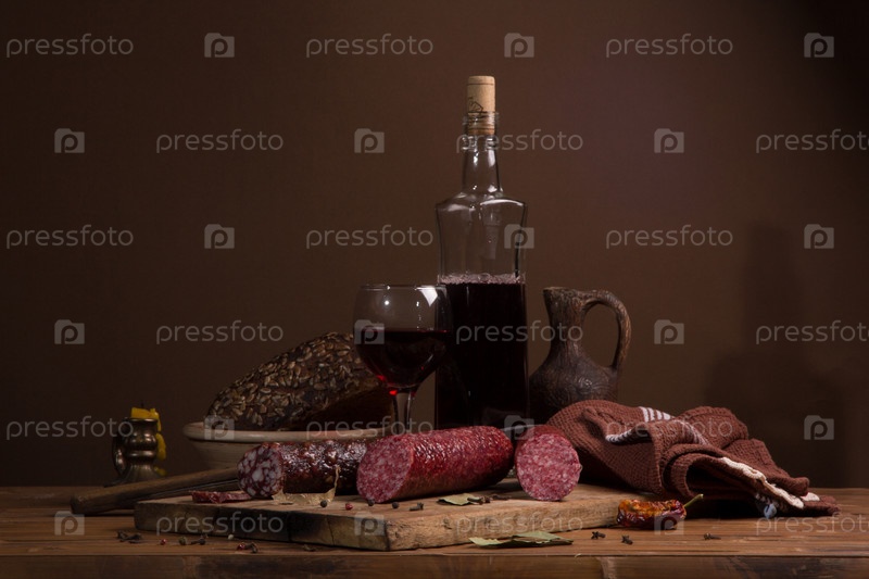 Натюрморт с вином и колбаса