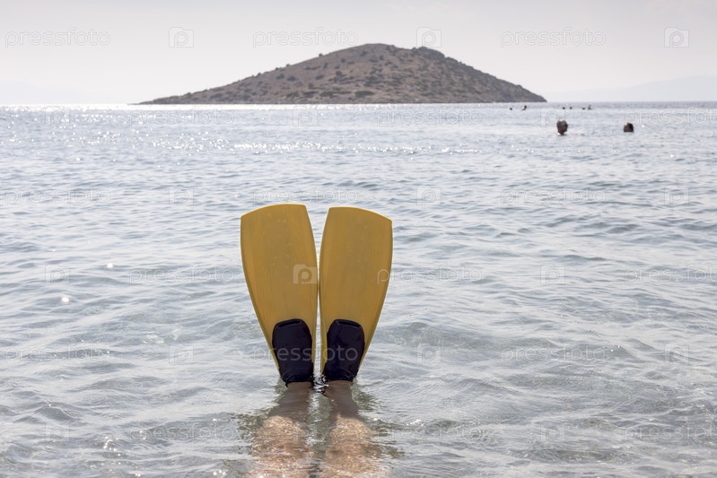 Женские ноги в ластах на фоне моря и острова