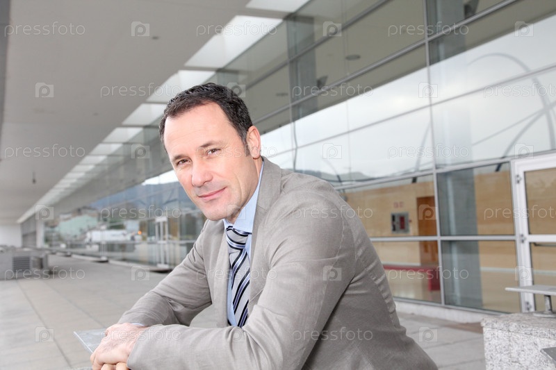 Бизнесмен, стоя вне конгресс-центр