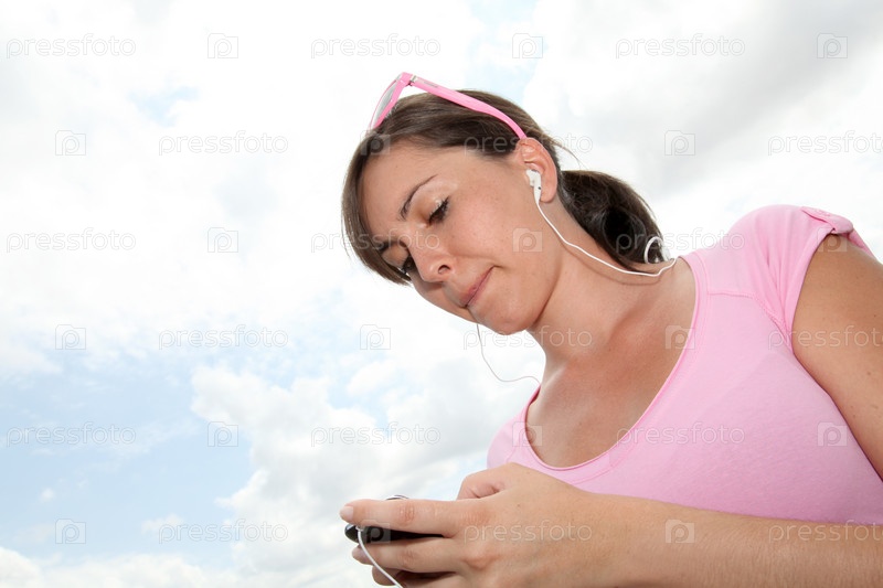 Молодая женщина, слушает плеер, прикусив губу