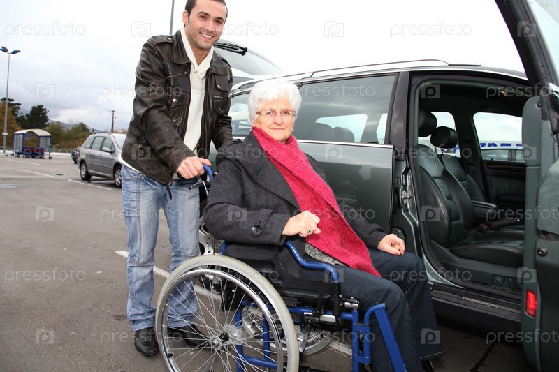Молодой человек, помощь женщина в инвалидной коляске
