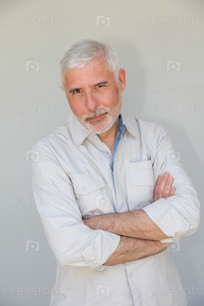 Старший мужчина, стоя на белом фоне