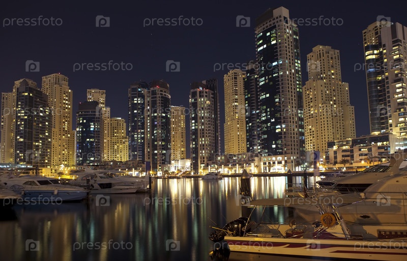 Современный мегаполис и яхты в порту, ночная панорама
