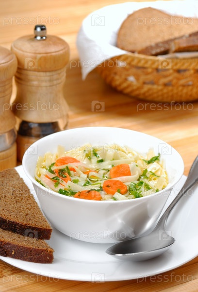 Суп-лапша с морковь на деревянный стол