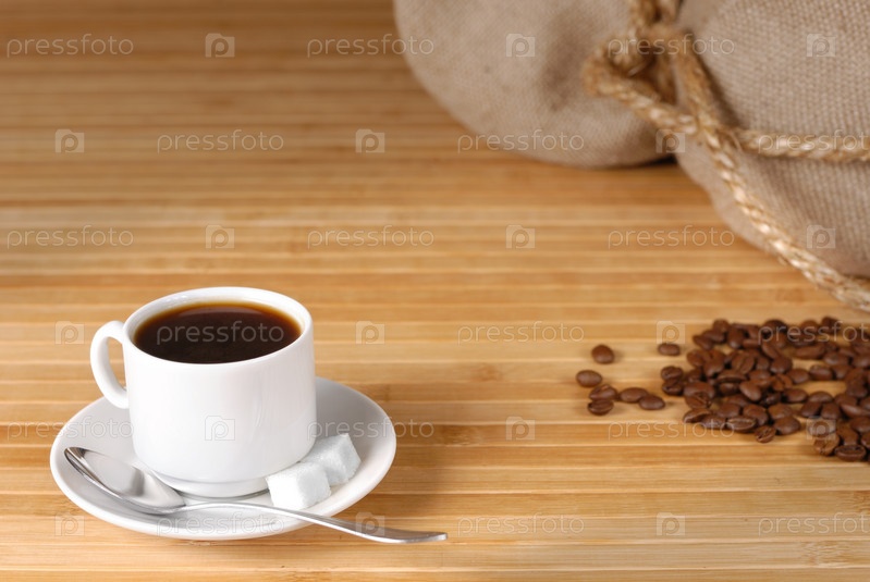 Чашка черного кофе и жареных кофейных зерен на деревянный стол