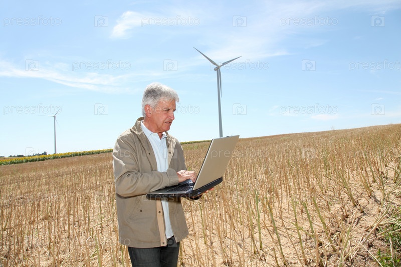 Агроном в пшеничном поле с портативного компьютера