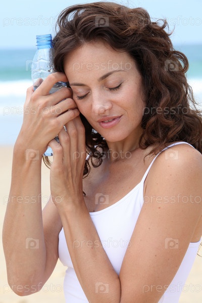 Красивая женщина питьевой воды на пляже