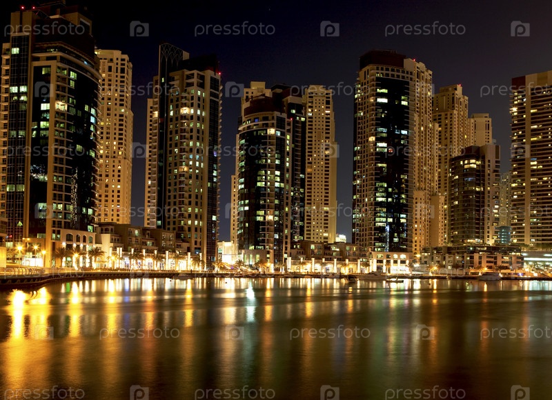 Панорама ночного Дубая, огни города отражаются в заливе