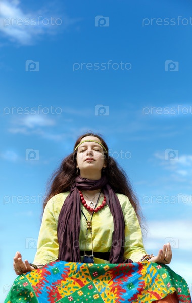 Молодая женщина на фоне голубого неба
