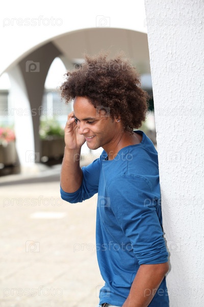 Молодой человек с голубой рубашке, разговаривает по телефону