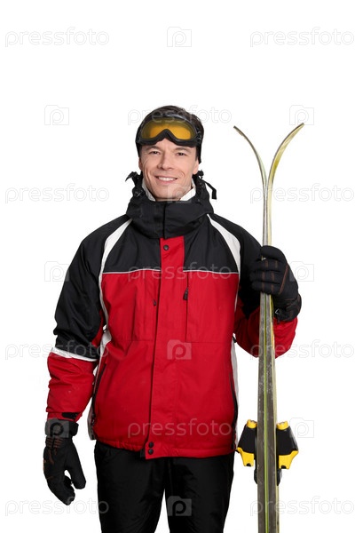 Человек в лыжный костюм стоя на белом фоне