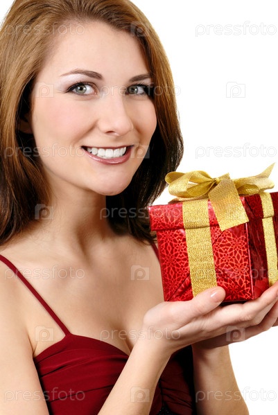 Девушка с подарочной коробке на белом фоне