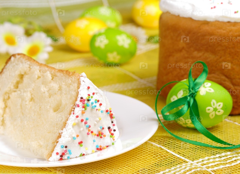 Пасхальные яйца и торт на ярком фоне