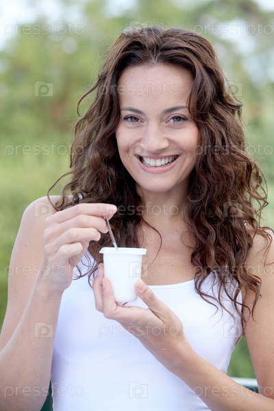 Крупным планом красивые женщины едят йогурт
