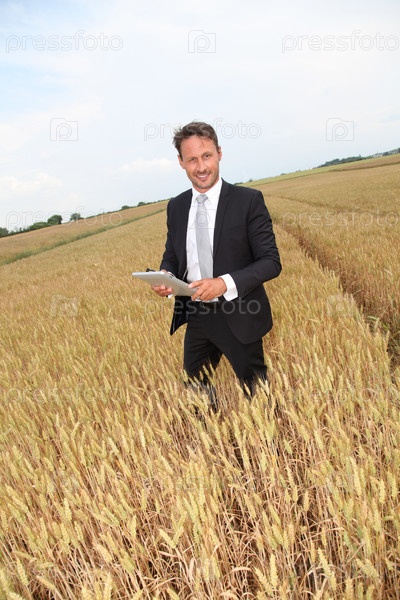 Бизнесмен с электронным таблетка стоит в поле пшеницы