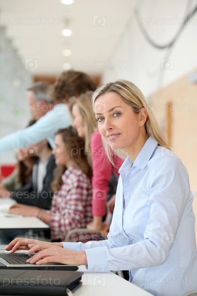 Преподаватель работает на ноутбуке в классе