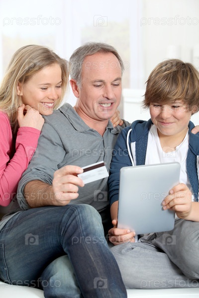 Отец и дети, делать покупки в Интернете на дому