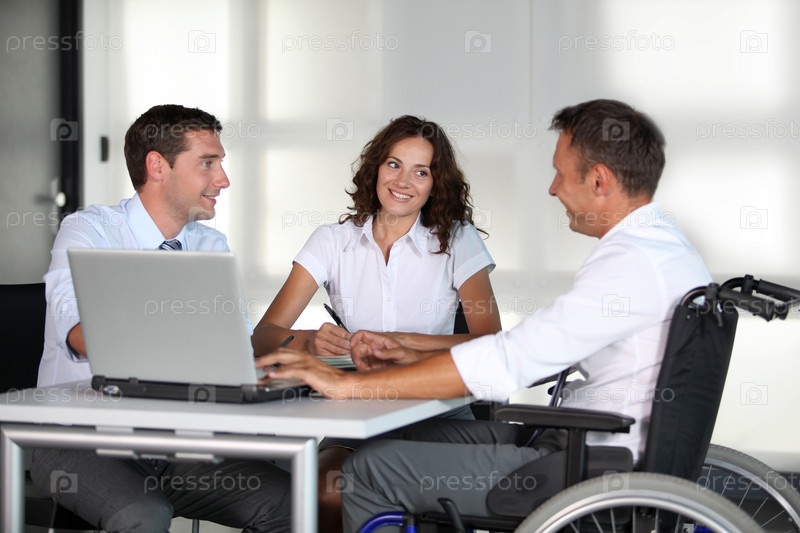 Бизнесмен в инвалидной коляске, работает в отделении с коллегами