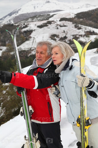 Пожилые супружеские пары на горнолыжном курорте