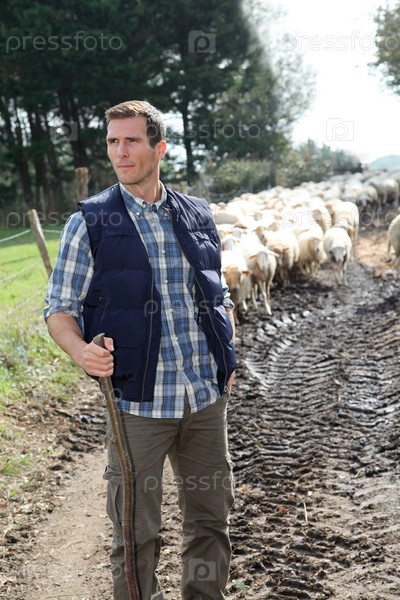 Пастух, стоя у овец в луг